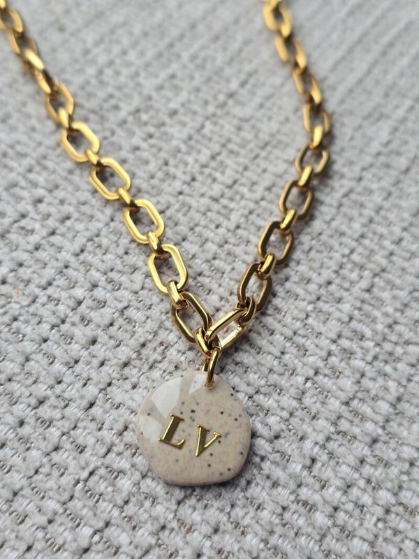 Stainless steel ketting in combinatie met handgemaakte bedel. Graag in het opmerkingen veld de initialen doorgeven (max 4 initialen). Vanaf 3 initialen zijn de letters op de bedel wat kleiner dan weergegeven op deze foto.